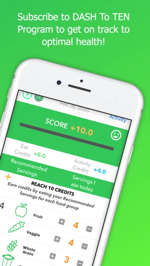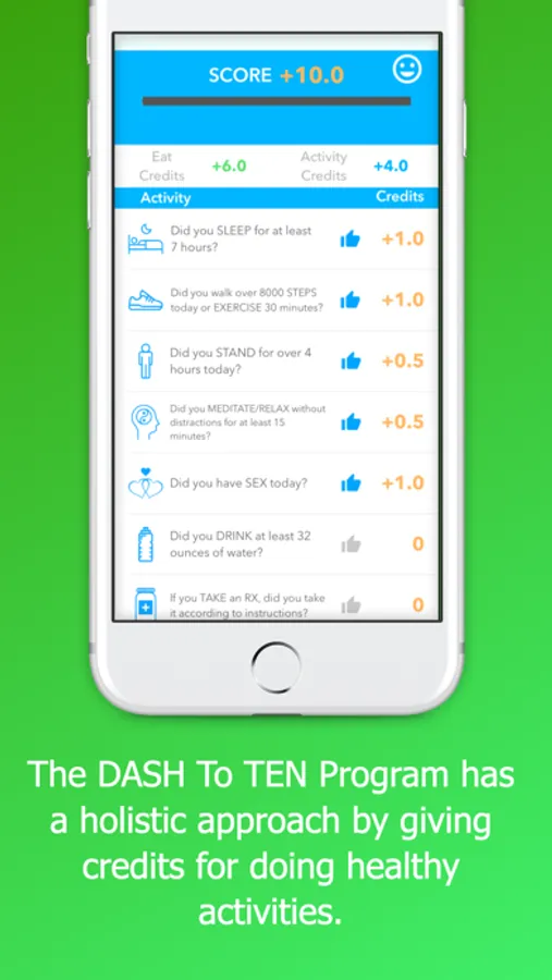 Have fun and get credit for your efforts! For only $9.99/monthly or $23.99/quarterly, as an in-app purchase, the DASH To TEN Program offers you an easy to follow program with a daily food group tracker along with a healthy activity tracker. Just click an icon to get credit for your efforts. Your goal on the program is to reach TEN credits a day by following your DASH Food Recommendations and doing healthy activities, like walking, sleeping, meditating, and even having sex!