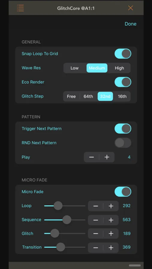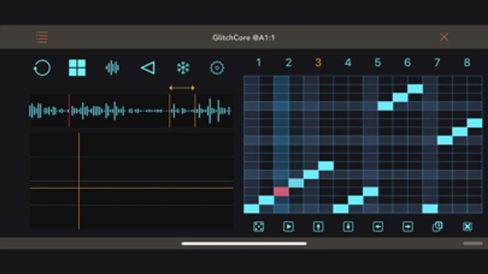 GlitchCore is an Audio Unit (AUv3) effect for re-sequencing live audio. It can rearrange audio that it processes. GlitchCore lets you glitch audio by making micro loops and scrubbing your sound. GlitchCore also lets you set loop points, variable loop lengths, and can reverse live audio.
