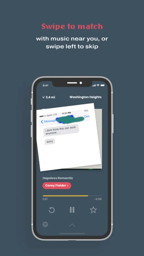 - Swipe to match with music near you, or swipe left to skip