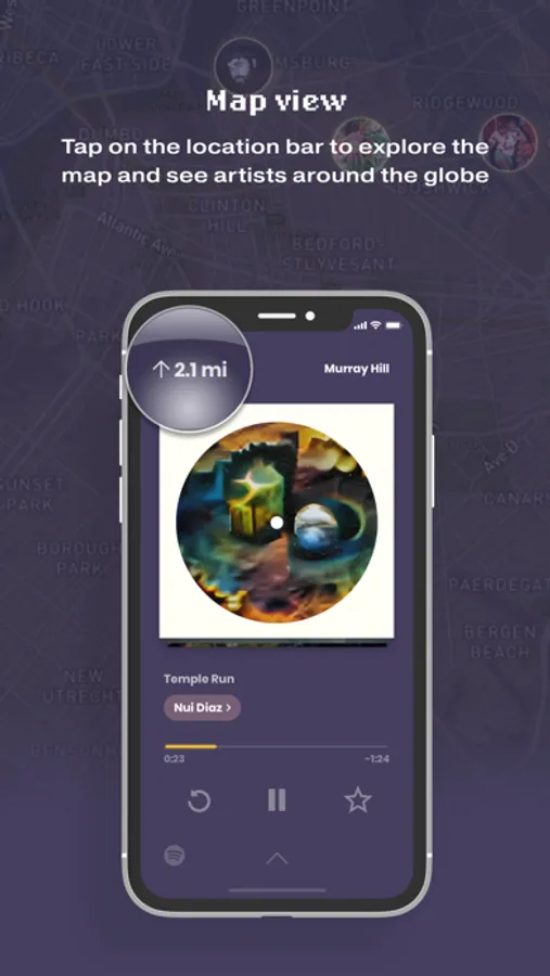 - Map view - Tap on the location bar to explore the map and see artists around the globe