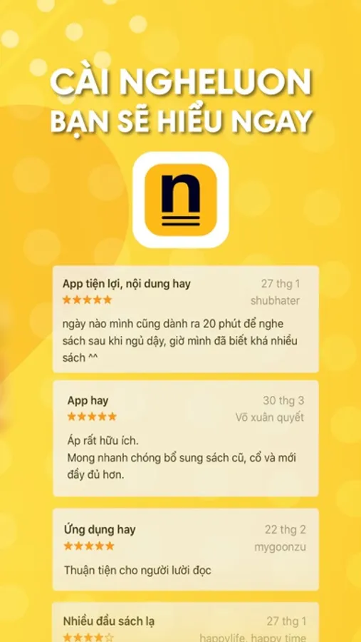 “Từ khi tải Ngheluon về điện thoại, mình nghe được nhiều sách hay hơn. Suy nghĩ của mình mở rộng hơn chứ không còn bị bó hẹp vào quan điểm của một vài cuốn sách nổi tiếng nào đó” (Lê Duyên, nhân viên văn phòng)