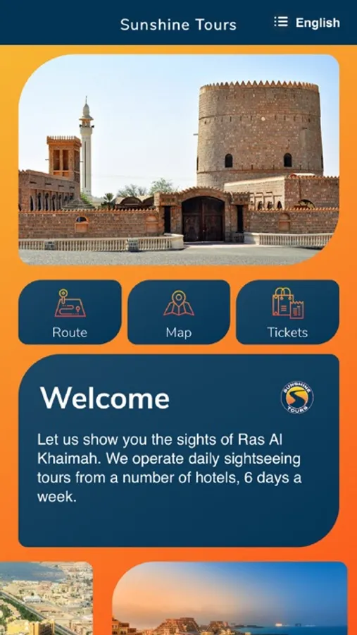 Sunshine Tours is a hop on, hop off bus tour of the best sites in Ras al Khaimah, UAE. Download the app to be able to view the sites along the route, listen to guided tours , a route map and link tobook tickets.