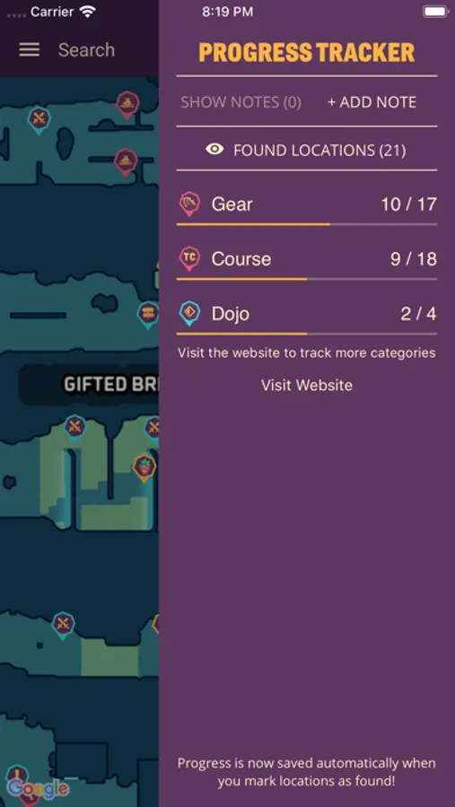 • Progress Tracker - mark locations as found and track the progress of your collectables.