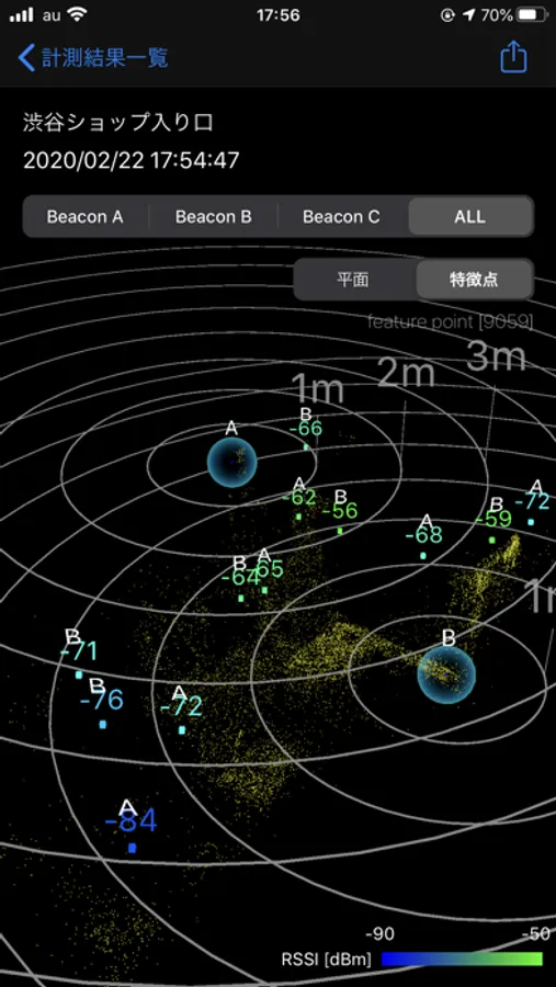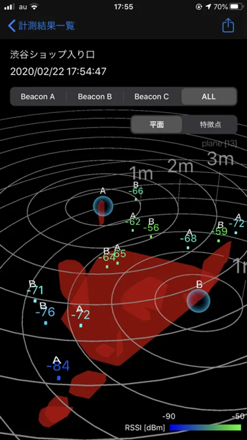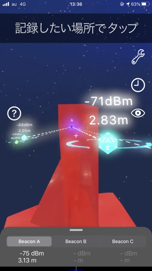 - 計測したい場所で画面タップすることで、ビーコンの電波強度を記録できます。