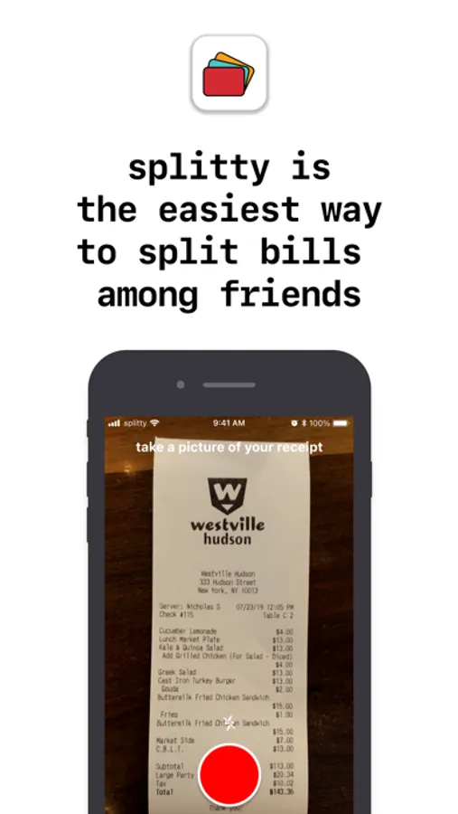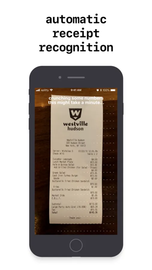 • Snap. Hold your phone over a receipt or upload one from your camera roll to get started. splitty uses advanced AI & ML tools to automatically identify the restaurant, the items you ordered, prices, and tax for you. It’ll even tell you how much to tip!