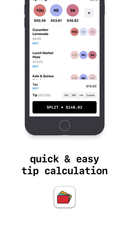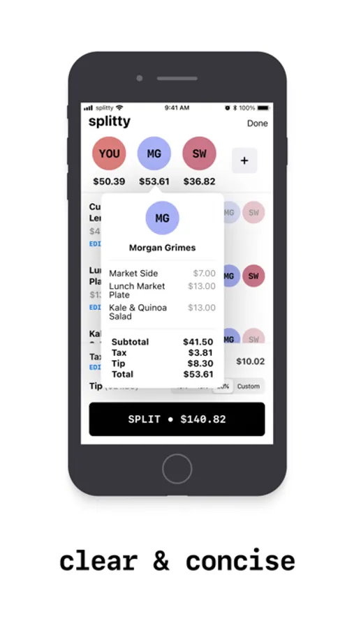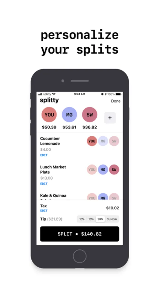 • Personalize your splits. Everything’s split by default, but it’s real easy to tweak. Have friends who didn’t share an item? Simply tap on their names and splitty will automatically compute their new total (tax + tip included).