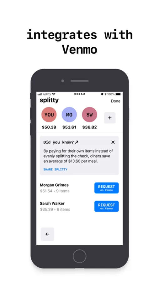 • Seamless payments. Once your bill is split, you can charge your friends the exact amount they owe (incl. tax + tip) with splitty’s seamless Venmo integration. No more back-of-the-napkin math, chasing down payments, or friends not remembering what they’d ordered!