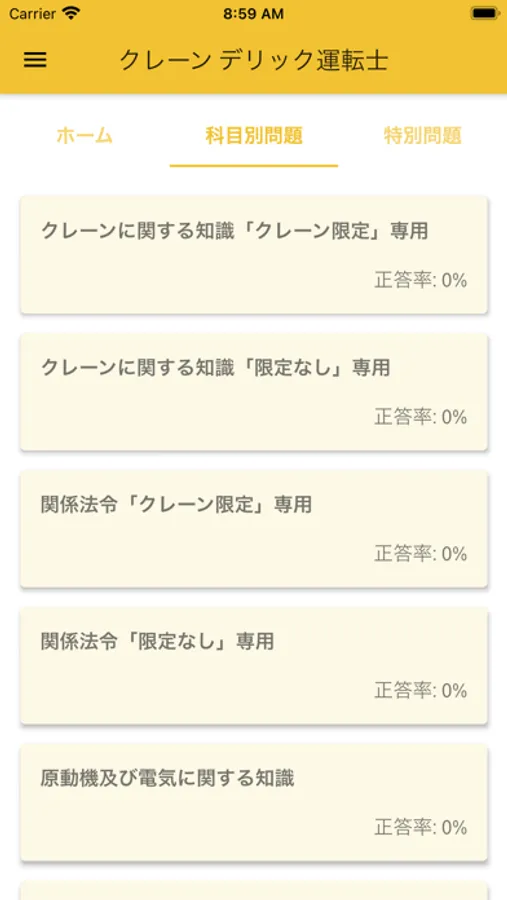 科目選択の、「クレーンに関する知識」「関係法令」でクレーン限定かクレーン限定なしを選択して下さい。