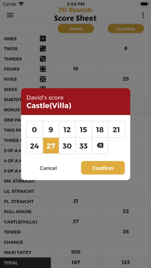 One pair, Two Pairs, Three Pairs, Five of a Kind, Full Straight, Castle/Villa, Tower, Maxi Yatzy.