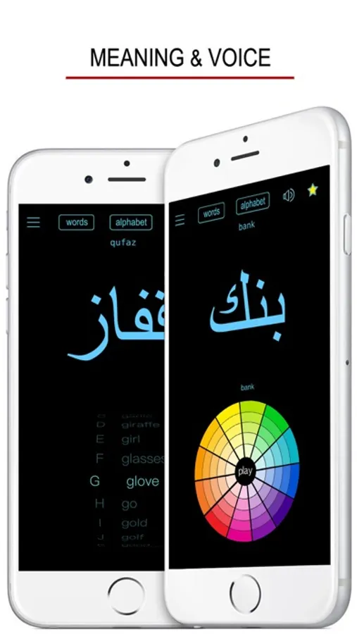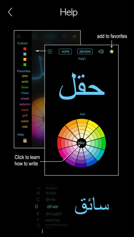 You can select the word in alphabetical order (English meanings) by clicking “words” in the menu bar. Basic everyday Arabic words!