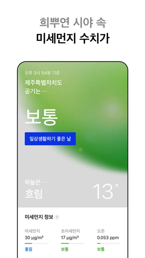 - 미세먼지 실시간 농도와 등급 제공