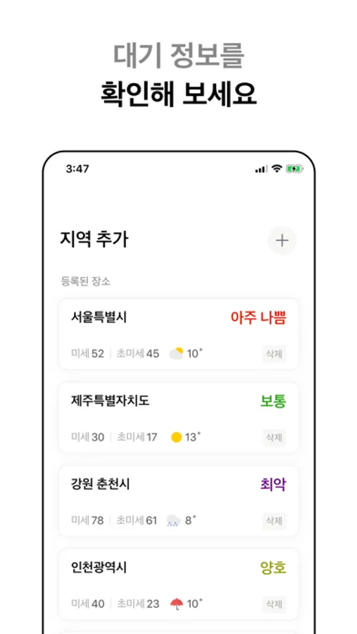 - 관심 지역 미세먼지 정보 한눈에 보기 제공