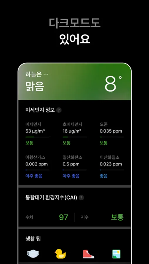 당신이 현재 위치한 지역의 정확한 측정값에 따른 대기오염 정도에 따라 움직이는 영상을 통해 미세먼지의 위험도를 한눈에 확인할 수 있습니다.