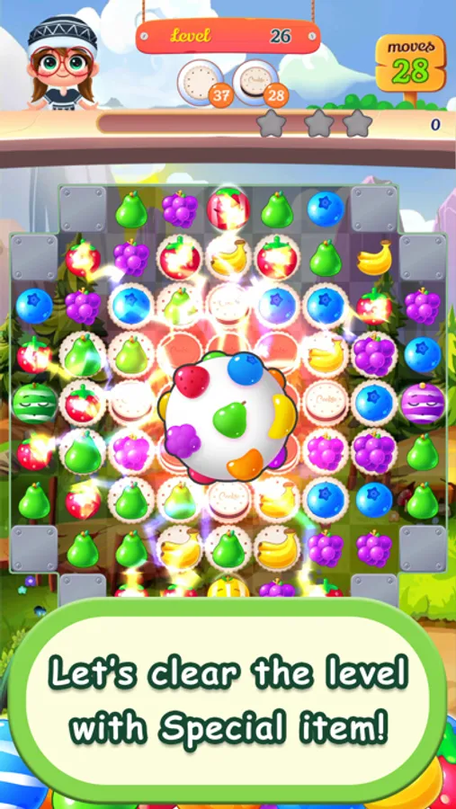 If you match 4 or more of a kind, a special item appears! You can clear loads of fruits with it.
