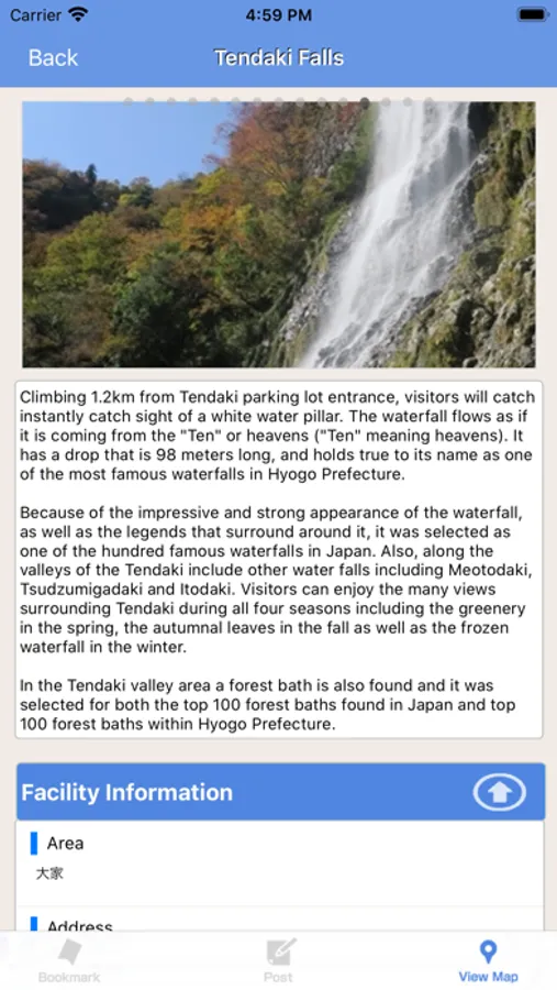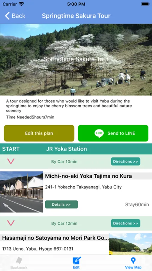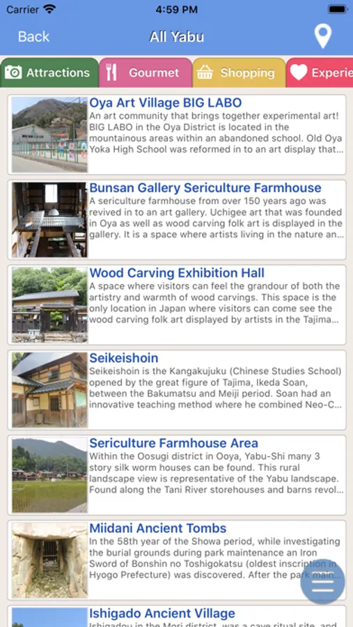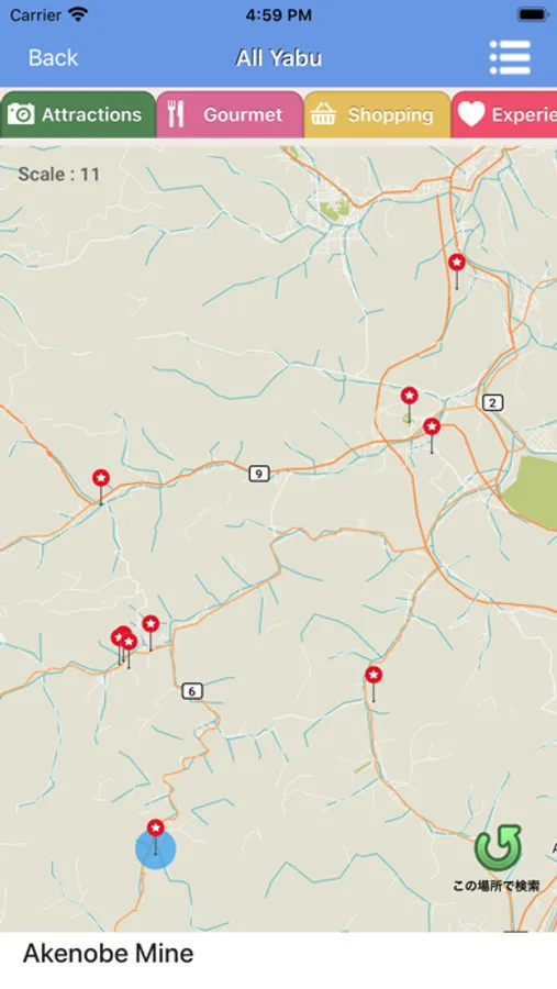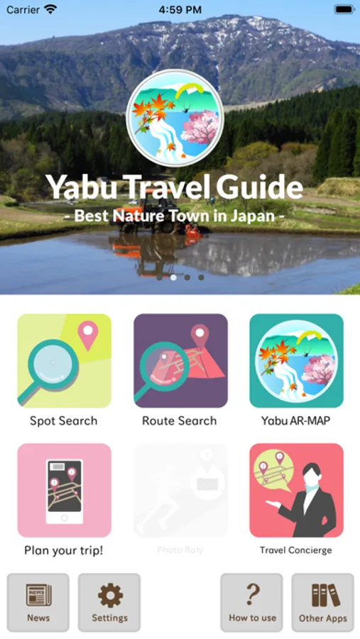 This is a travel app that introduces and allows you to navigate through sightseeing spots and recommended places in Yabu city for a range of activities, like sightseeing, eating, hands-on activities, and more.