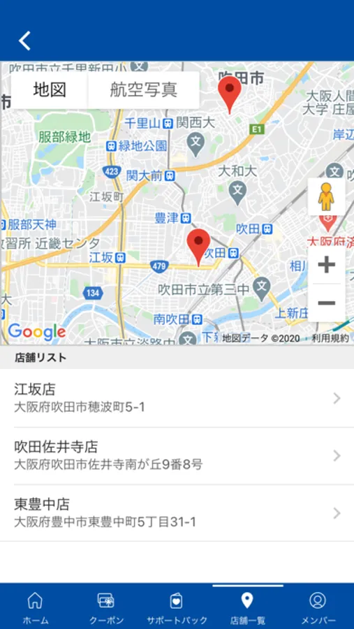 都道府県からの検索、GPSを用いて現在位置から近隣の店舗を検索。お気に入りの店舗を登録できます。