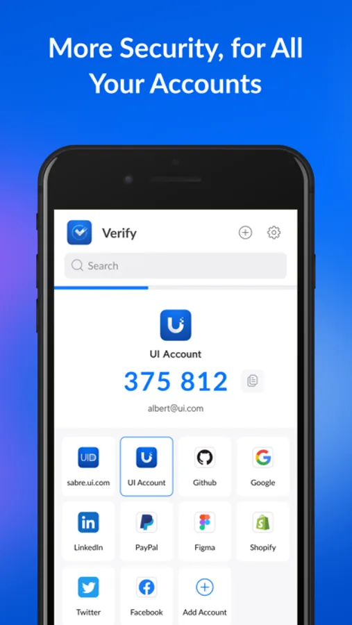 Verify gives your accounts an additional layer of security by requiring two-factor authentication (2FA) of each login attempt. With this feature enabled, users will need to provide their password and a time-sensitive verification code generated either in the app or via push notification. Verify can also supply users with a set of single-use passwords that can be stored locally on their phones should they ever need to circumvent an issue with their main 2FA method.
