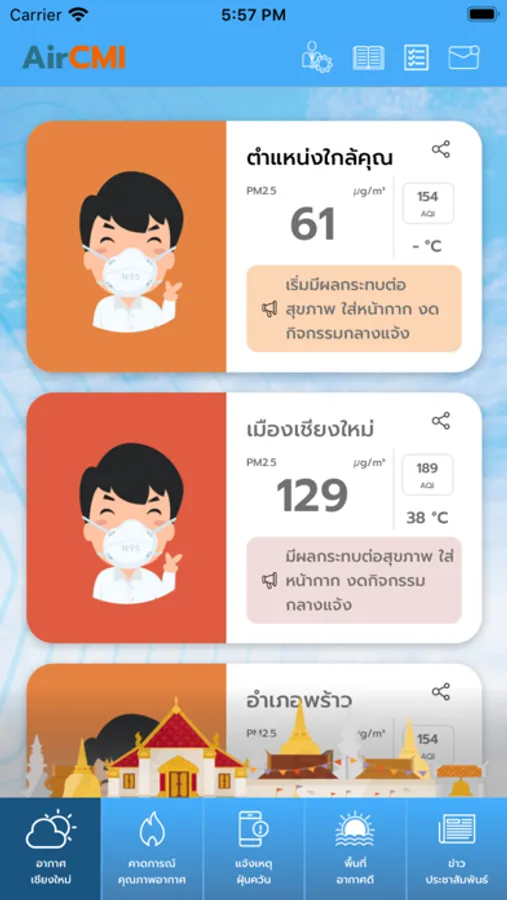 โปรแกรม Air CMI อากาศดีเชียงใหม่ แสดงปริมาณฝุ่นละอองขนาดเล็ก PM2.5 แบบเรียลไทม์จากเครื่องตรวจวัดคุณภาพอากาศที่ติดตั้งในจังหวัดเชียงใหม่ มากกว่า 200 จุด จากความร่วมมือพัฒนาข้อมูลของ จังหวัดเชียงใหม่ กรมควบคุมมลพิษ กรมอนามัย กรมอุตุนิยมวิทยา สำนักงานพัฒนาอวกาศแห่งชาติ มหาวิทยาลัยเชียงใหม่ และ สำนักงาน ป.ย.ป.