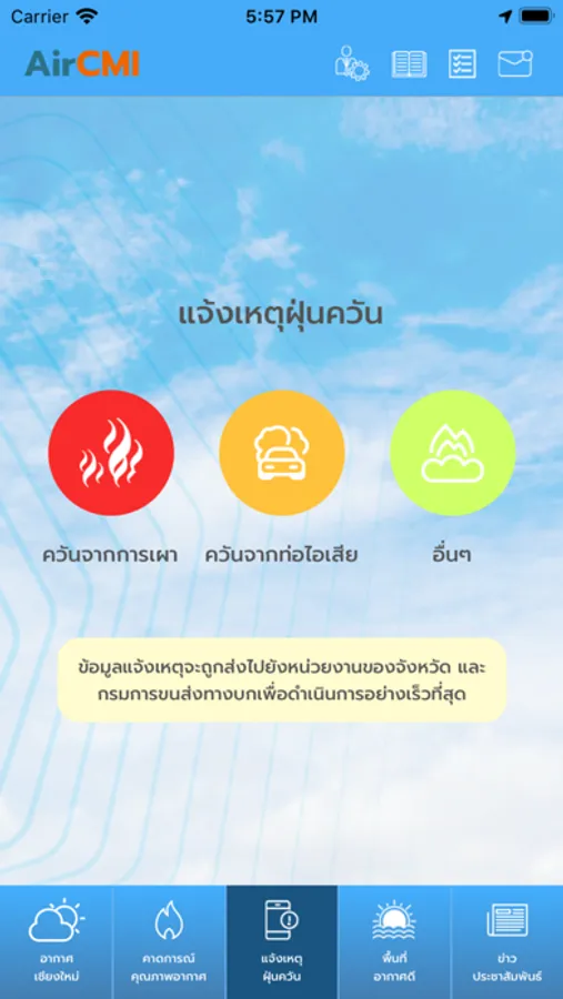 - แจ้งเหตุเมื่อพบแหล่งฝุ่นควันได้ทันที ข้อมูลจะส่งไปยังหน่วยงานที่รับผิดชอบทันที