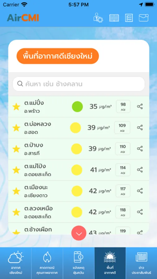- แสดงปริมาณฝุ่นละอองขนาดเล็ก PM2.5 จากตำแหน่งผู้ใช้งาน ด้วยการดึงข้อมูลจากเครื่องตรวจวัดคุณภาพอากาศที่ใกล้ที่สุดจากเครื่องวัดคุณภาพอากาศมากกว่า 200 เครื่องที่ติดตั้งทั่วจังหวัดเชียงใหม่ ครอบคลุมทุกอำเภอและตำบล