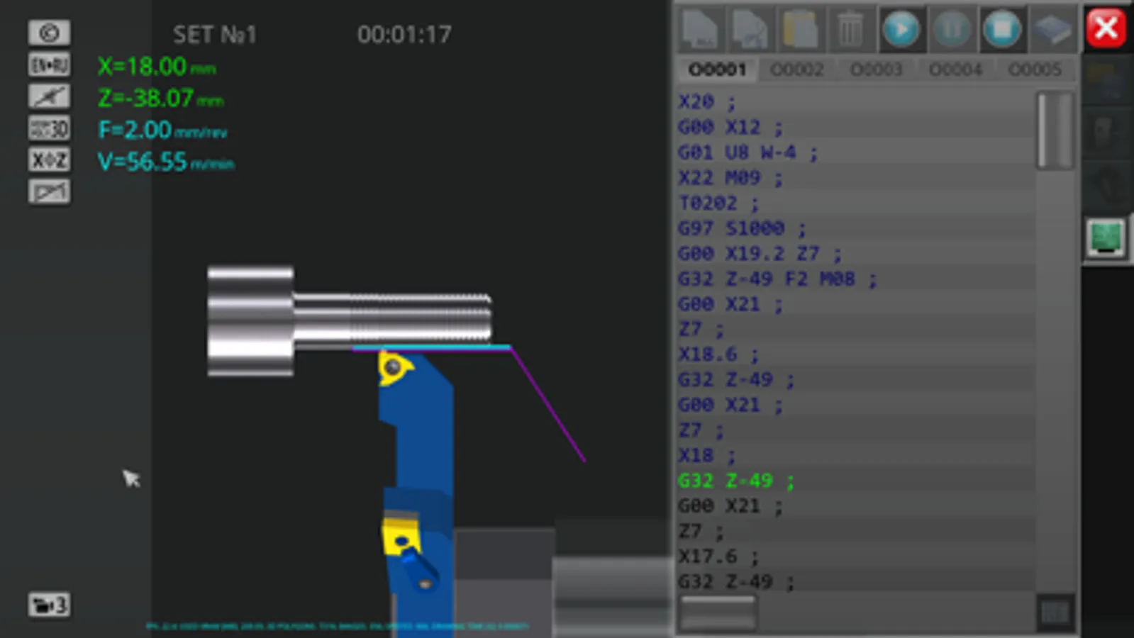 The functionality of the simulator: preparation of texts of control programs of turning operations in the format of a standard G/M-code, checking control programs for syntax and technological errors, playing on the computer screen (or other computing device) three-dimensional graphic models of the main components of the lathe machine and metal-cutting tools to simulate the process of turning metal, the three-dimensional visualization of the process of forming parts during turning on the compiled control programs, visualization of toolpaths, implementation of interactive user interaction with the simulation model of technological equipment.