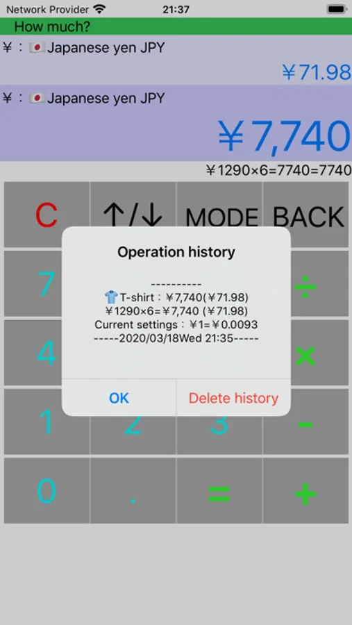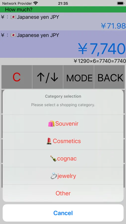 When you touch the “= (equal)” button without any calculation formula, a sub screen for entering items appears. You can keep a record of what the price is.