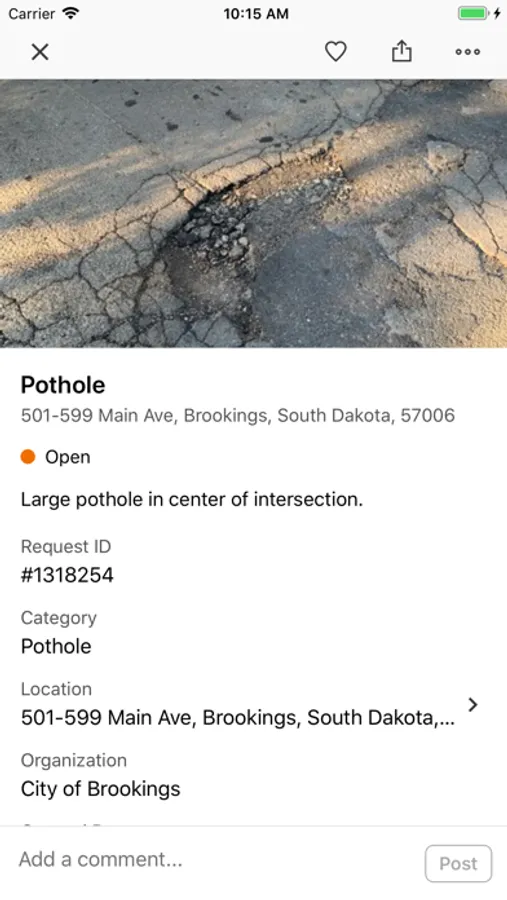 The Engage Brookings app makes it easier than ever for you to bring attention to matters that are important to you, your neighborhood, and your community. We give you the ability to submit service requests and access helpful information 24/7. Use it to report non-emergency City of Brookings concerns such as potholes, street maintenance issues, code violations, and more. You can also utilize it to make suggestions and requests; simply select an option from the list of common community requests and concerns and use the prompts to enter and submit the necessary information. The app utilizes GPS software to help you provide the location of an issue accurately. You can also snap a photo or include a video with your request to help those working on your claim quickly identify the item. Submit as yourself or anonymously; once sent, you can track the status of your submission from start to finish. Be an actively engaged citizen by downloading the free Engage Brookings app.