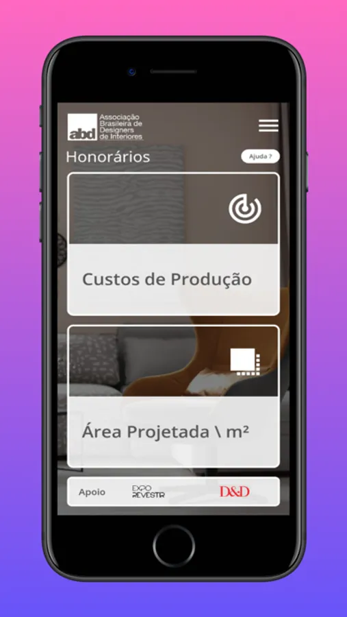 O app Cálculo de Honorários é um aplicativo destinado aos associados da ABD cujo objetivo é auxiliar na formação de preço de projetos de arquitetura de interiores. Note que não se trata de uma ferramenta de elaboração de propostas visto que esse tipo de documento deve ser elaborado por softwares destinados especificamente para esse fim.