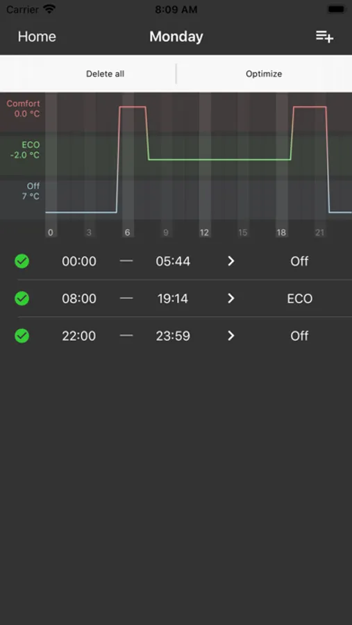 Die App ermöglicht die zeitabhängige Steuerung der Betriebszustände „Aus“, „Eco“ und „Komfort“. Die Komfort-Temperatur wird über die Einstellung des Drehrades am Raumbediengerät eingestellt. In der Eco-Funktion wird diese Temperatur um einen, über die App, frei wählbaren Wert abgesenkt. Im Modus „Aus“ ist ausschließlich der Frostschutz aktiv, der dafür sorgt, dass eine Raumtemperatur von 7°C nicht unterschritten wird.