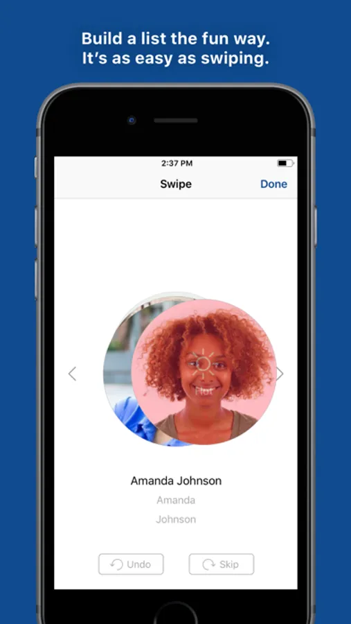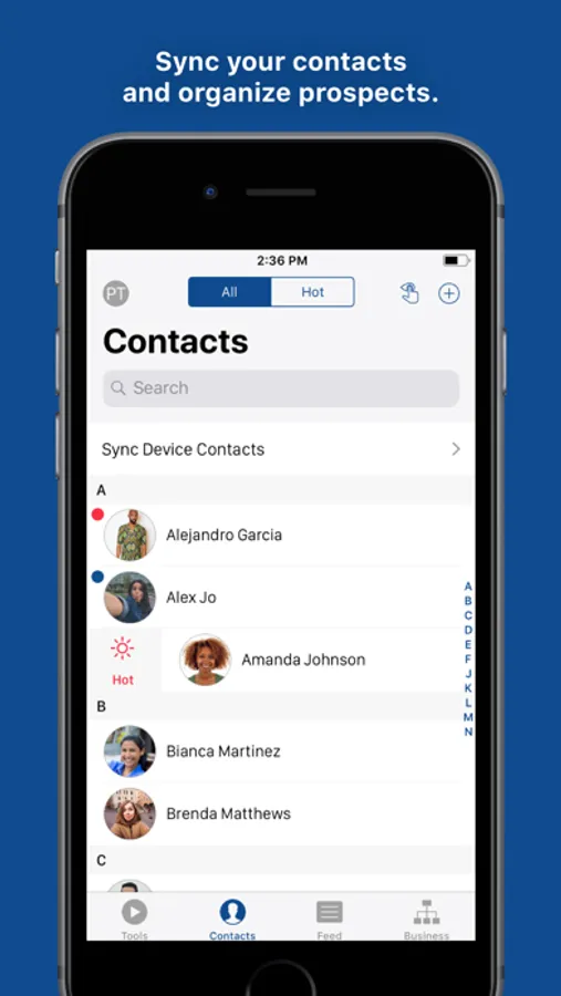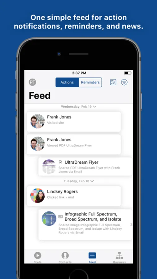 Contacts: Choose how to sync and manage your contacts. Swipe to sort them by interest level. You can make connections, add notes, or check out the Contact Feed to see the tools you've shared and contact actions.