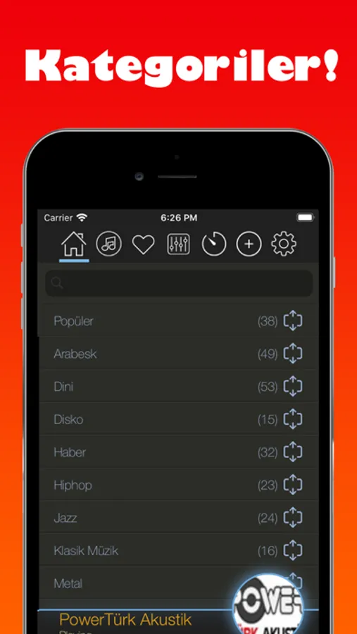 Popular, Arabesque, Religious, Disco, News, Hiphop, Jazz, Classical Music, Metal, Rock, Slow, Sports, Techno, Turkish Folk Music, Turkish Art Music, English Pop, University Radios, Foreign Pop, Child, Regional.