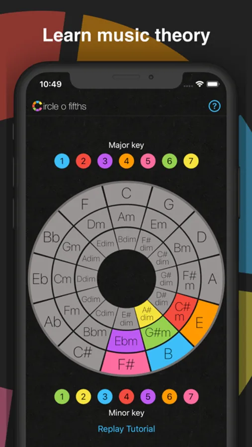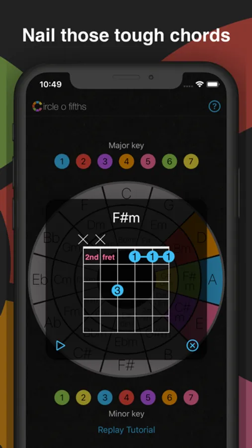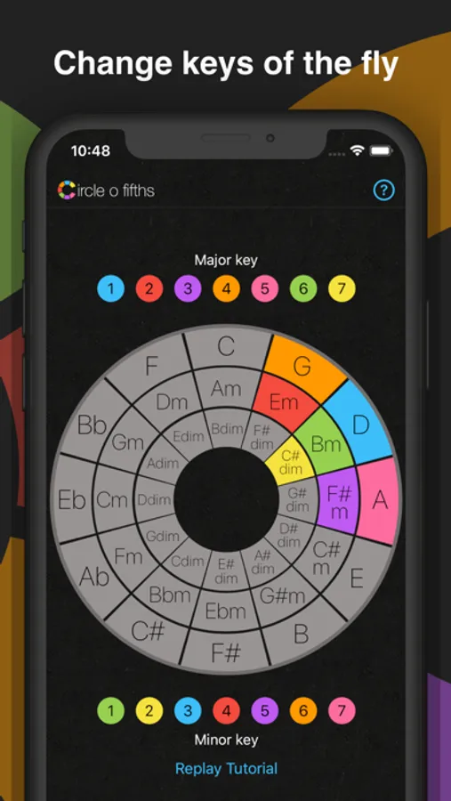 The outside ring of the circle has all the major keys. Tap on any of them to hear and change the key. The color coding will tell you which number the chord or note is. The middle ring has all the minor keys, and the inner ring has the diminished chords/notes. You can tap on any chord/note to hear how it sounds, and tap and hold to see the guitar chord and how to play it!