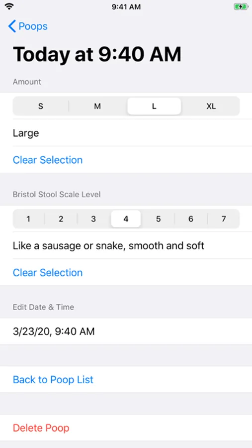 You can optionally save the amount and hardness of each poop based on the Bristol Stool Scale.