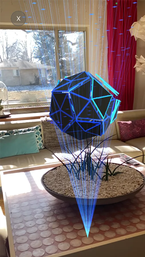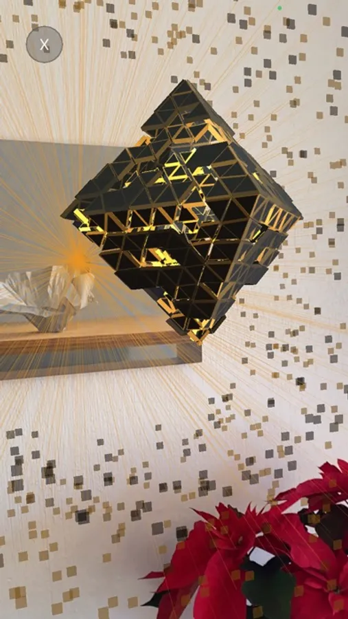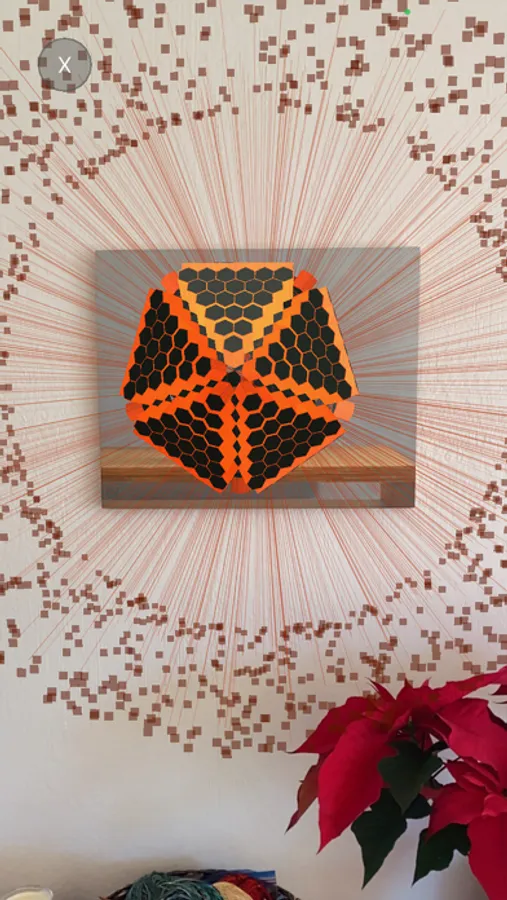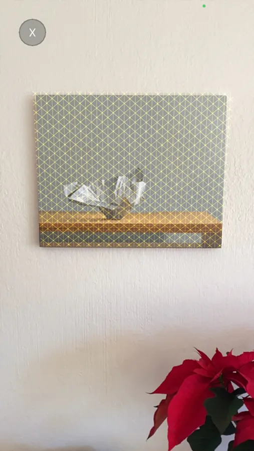 For the digital augmented reality experience, point your device at the paintings or a surface, and experience a sound and light experience. The program is structured around simple geometric shapes, with sounds affected by your location and touch.