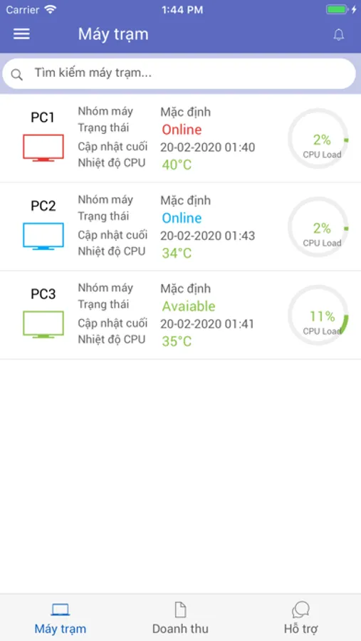 - Xem danh sách các máy trạm ( tình trạng hoạt động, nhiệt độ CPU, Ram...)