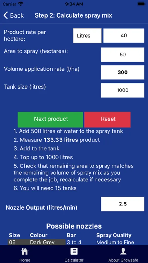 A tool to calculate and suggest a nozzle size and calculate how much agrichemical product you need to add to your spray tank or tanks to achieve target application rate with a boom type sprayer.