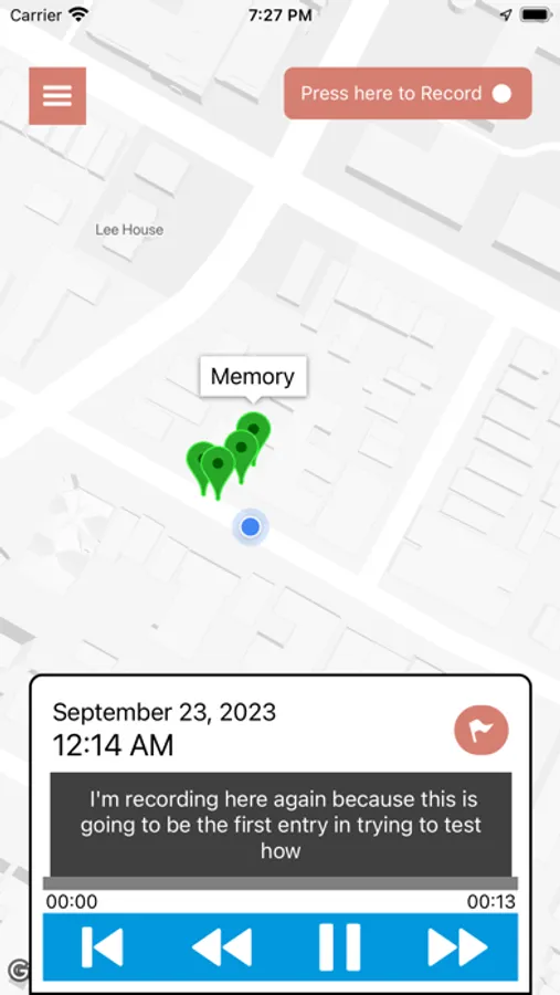 The Matter of Memory is an ongoing work that investigates the relationship between memory and place. This smart-phone application can make an audio recording tied to a specific location. When the user is about to record, they are presented with the question, “Why is this place important to you?” Once the recording is uploaded, users must be within 100 feet of the place where it was recorded to be able to listen to it.