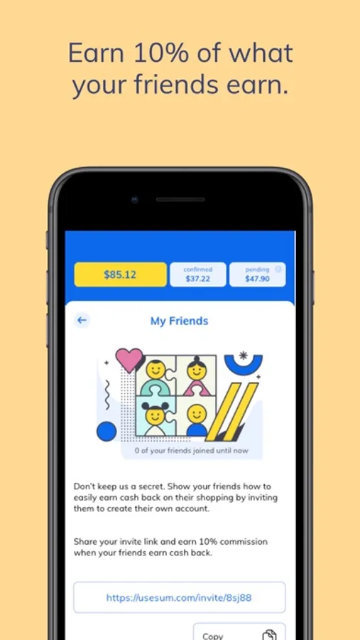 Invite a friend and earn 10% > Show your friends how to easily earn cashback on their shopping by inviting them to create their own account, and get 10% of everything they earn.