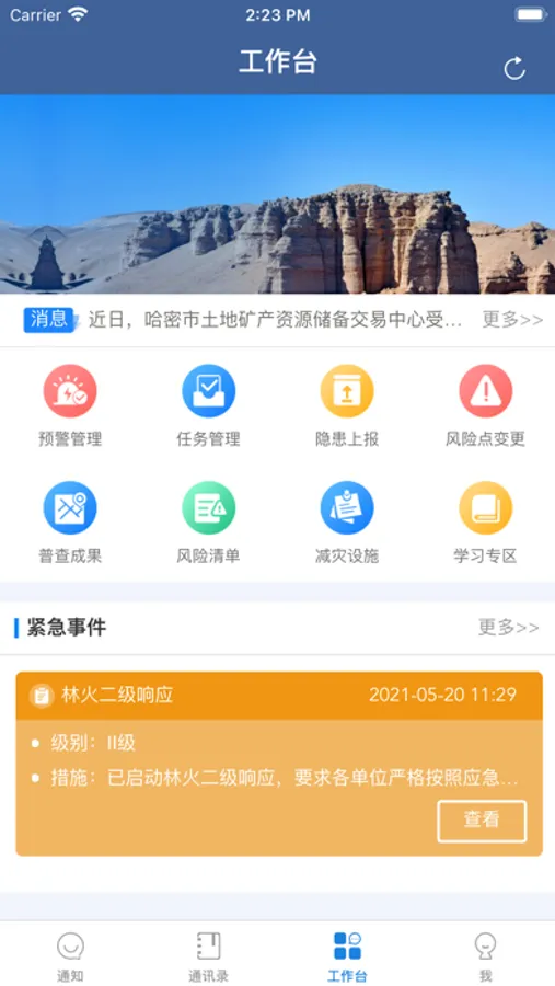 将预警中心、指挥中心与网格员相连接,在日常工作不仅能接收、反馈中心发布的日常信息与任务,也能上报发现的问题与情况,并通知上级核实;同时作为应急响应信息与任务发布的主要载体,第一时间通知到网格员,实现风险网格化管理。