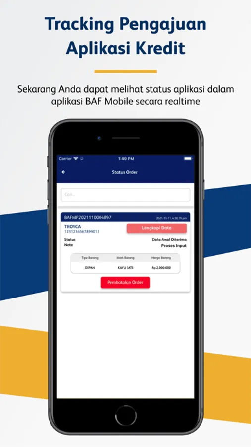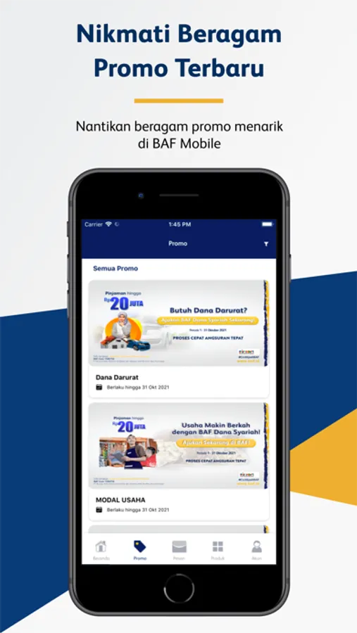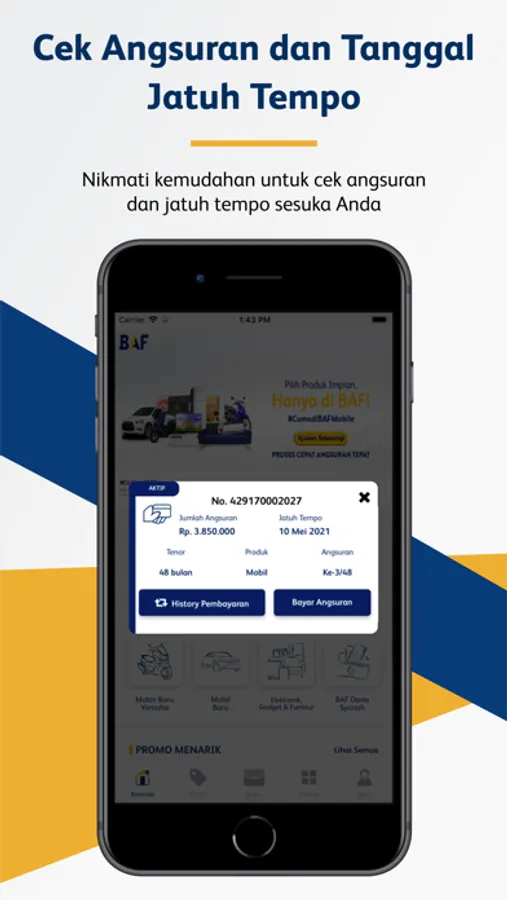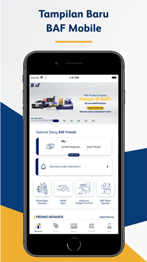 BAF Mobile hadir memberikan kemudahan dan kenyamanan layanan bagi BAF Friends (konsumen BAF) dalam mengajukan pembiayaan. Selain dapat diakses dimanapun dan kapanpun, dengan BAF Mobile akan mendapatkan layanan proses yang cepat dengan cicilan yang tepat melalui beragam promo/prgram menarik yang sayang untuk dilewatkan.