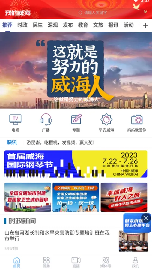 “我的威海”客户端不仅拥有本地更及时、更准确、更权威的新闻信息,而且也汇集了国外热点资讯内容,同时有效实现了电视大屏与手机小屏的互联互通,集电视直播、视频点播、电台直播、电台点播、便民服务、手机直播、精彩活动等为一体;拓展新闻+政务+服务新领域,整合广电媒体资源、政务资讯、便民信息,是一个集视听新闻发布、重大活动直播、行风政风互动、智慧便民服务等功能于一体的新闻客户端;通过整合优质内容资源,服务城市多样化,打造便民综合服务云平台,构建全媒体融合生态圈,开创精致城市宣传舆论工作新局面,为宣传威海、服务威海、推介威海发挥积极的作用。
