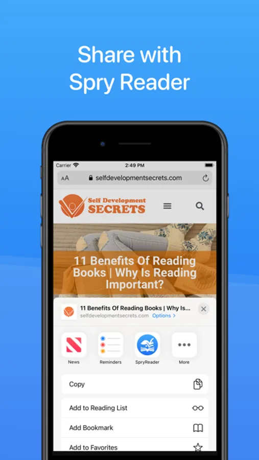 * Share with Spry Reader - Spry Reader has been integrated into your browser and Files app so that you can Share articles and ebooks directly to your private library.