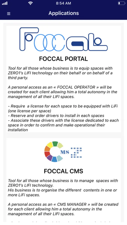 Our customers / partners will access with Login and password to the business webapps of the "FOCCAL" platform to manage their spaces equipped with OCC ZERO1 technology. Whether you are in the office or on sites equipped or in the process of being equipped, this app makes it easier for you to manage your spaces and is the key to your efficiency in setting up.