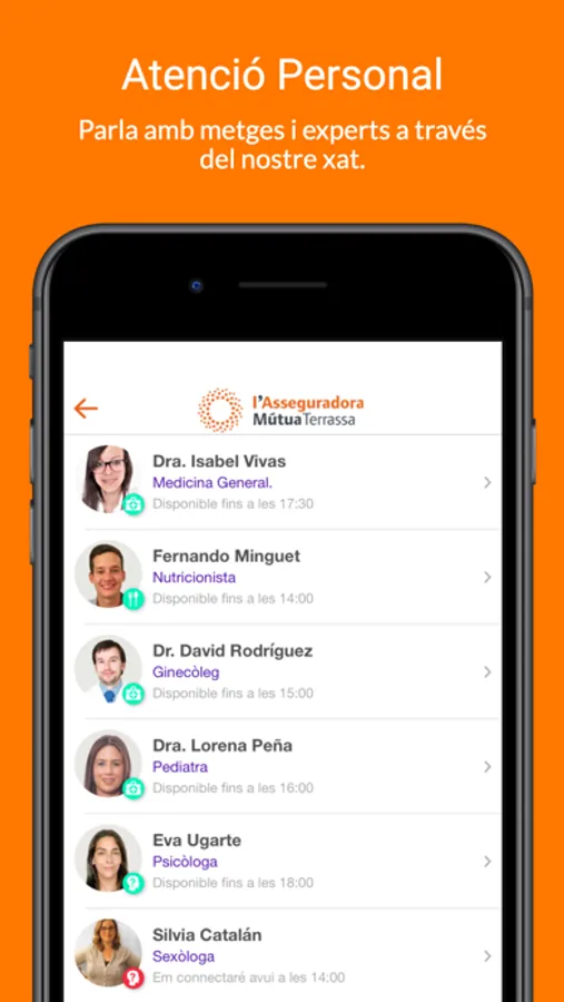 Podràs contactar amb un metge a través del xat en qualsevol moment, disponibilitat les 24hores/7dies de la setmana, de forma immediata i il·limitada, de les següents especialitats: