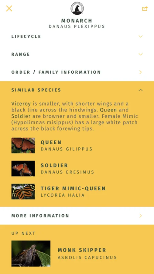 • Search by name (common and scientific) using either keyboard or verbal search systems; type or speak all or part of a butterfly’s name to search for its detailed account.