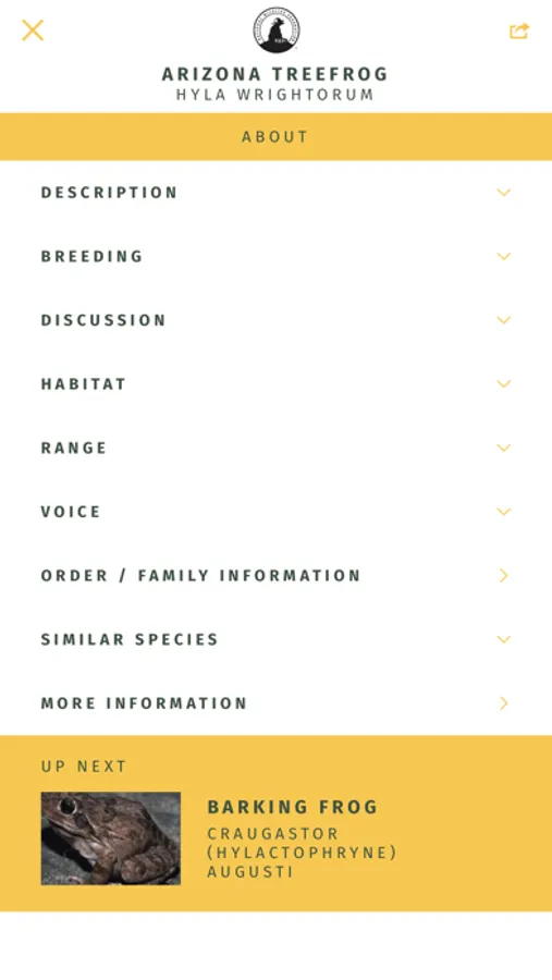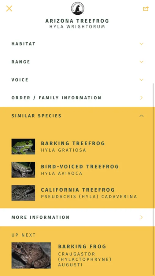 • Search by name (common and scientific) using either keyboard or verbal search systems; type or speak all or part of an amphibian’s name to search for its detailed account.