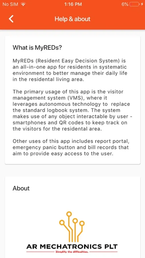 The primary usage of this app is the visitor management system (VMS), where it leverages autonomous technology to replace the standard logbook system. The system makes use of objects familiar to the user - smartphones and QR codes to keep track on the visitors for the residential area.