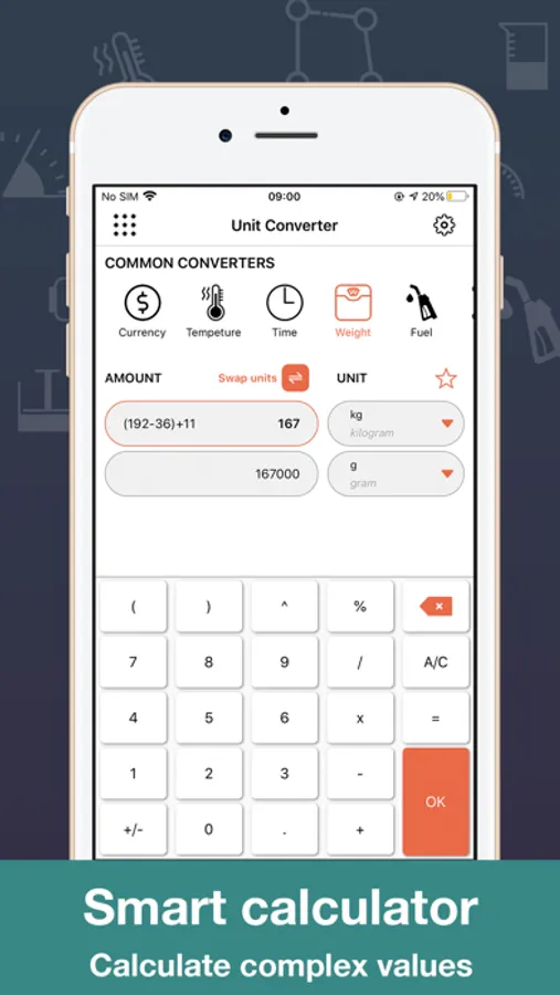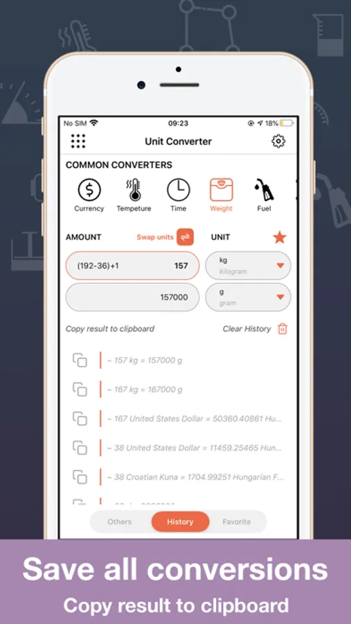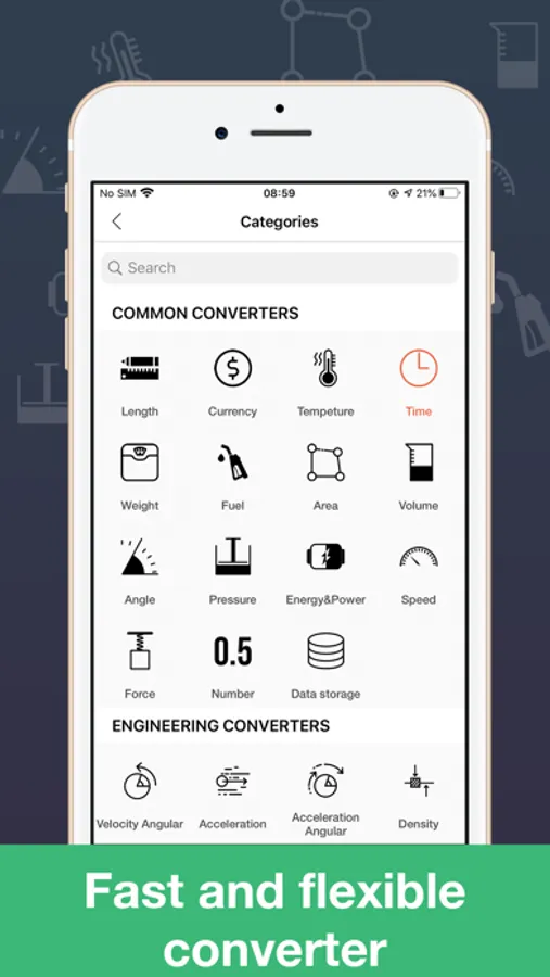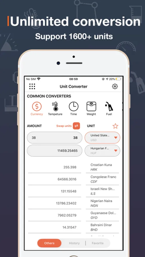 - Common converters: Length, Currency (more than 150 world currencies), Temperature, Time, Weight, Fuel, Area, Volume, Angle, Pressure, Energy&Power, Speed, Force, Number, Data storage.