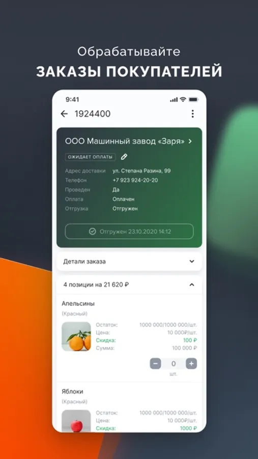Работайте с созданными вручную или полученными из интернет-магазина заказами покупателей. Изменяйте статусы и содержание документа.