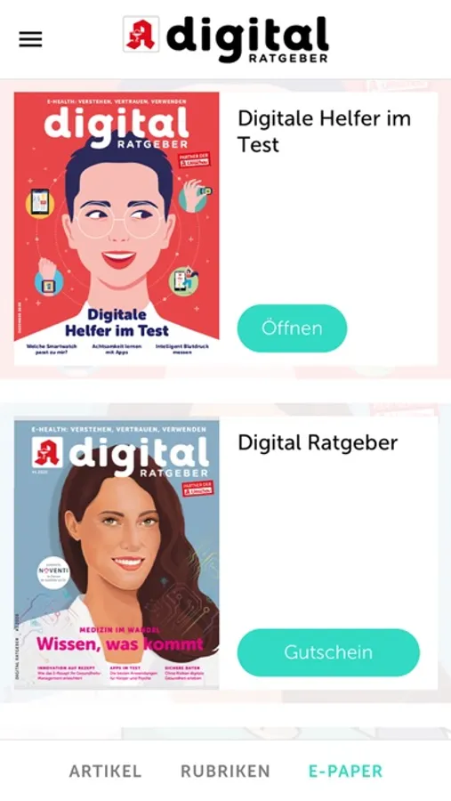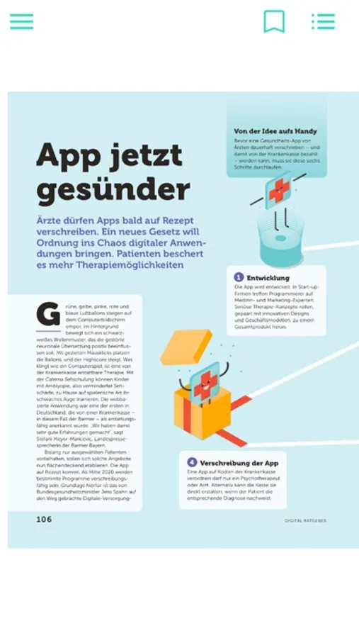Mit der E-Paper App des Magazins steht Ihnen der Inhalt der gedruckten Ausgabe digital für Ihr iPhone oder iPad zur Verfügung. Das E-Paper des Magazins berichtet beispielsweise über das E-Rezept, die elektronische Patientenakte und Gesundheits-Apps. Die Ausgabe enthält zwei Poster im Lesemodus: Apotheke der Zukunft und Krankenhaus der Zukunft.